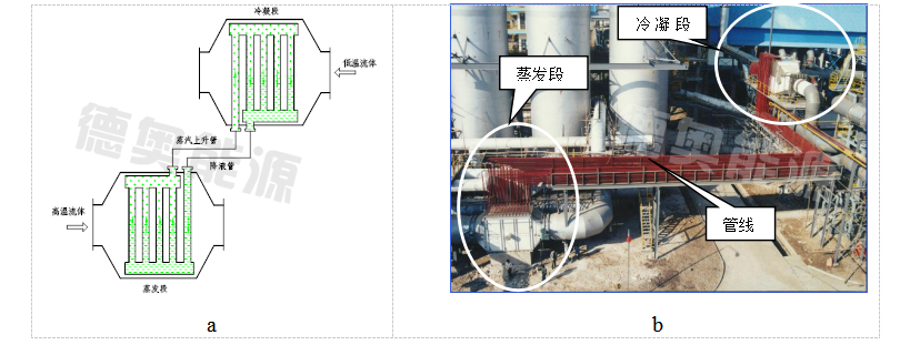 圖2為某廠的熱管空氣預熱器,a為換熱器內部簡圖,b為實物照片,采用的是分離式結構型式,連接管線達50m,實現(xiàn)遠程傳熱。此外該型式換熱器還可實現(xiàn)煙氣同時與多種氣體進行熱交換,除了加熱空氣外,還可加熱其他工藝氣體,從而實現(xiàn)廢熱利用的最大化。