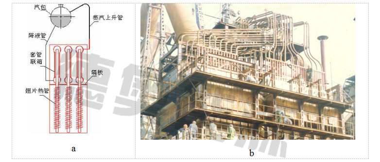 熱管蒸汽發(fā)生器,又稱熱管余熱鍋爐,兼有水管鍋爐和火管鍋爐的優(yōu)點,啟動迅速。其結構可以是熱管冷端直接插入汽包,也可以是前面介紹的夾套聯(lián)箱與汽包連通的結構型式,如圖4a所示。年產(chǎn)10萬噸硫酸的某硫酸廠,采用了一臺熱管式蒸汽發(fā)生器用以回收SO2爐氣余熱,產(chǎn)生2.5MPa,9.50 噸/小時飽和蒸汽,回收熱量6497.5kW,如圖4b所示。爐氣經(jīng)過熱管蒸汽發(fā)生器后降為355℃進入電除塵室。圖4a中隔板的下部為熱管的吸熱段,焊有螺旋翅片。上部為熱管的放熱段,采用水夾套結構,經(jīng)集箱集汽后經(jīng)上升管與汽包連接。冷熱側由隔板完全分開, 即使出現(xiàn)有個別熱管磨損破壞,也只會是熱管內部少量工作流體流入煙道,不會影響正常生產(chǎn),避免了大量爐水向煙道泄漏而導致停產(chǎn)。各熱管通過控制加熱段傳熱面積使管壁溫度>230℃,可有效地防止露點腐蝕。如每噸蒸汽按60元計,年運行7200小時效益可達430余萬元,設備投資可在一年內收回。