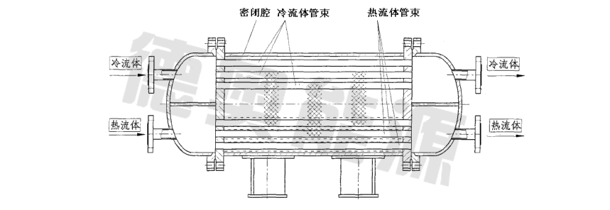 密閉腔式換熱器是熱管技術衍生的一種新型管殼式換熱器,如圖5所示,其他結構型式參見文獻[7]。密閉腔由兩端孔板與筒體殼體組成,內沒有多余的部件,故而結構簡單;同時冷熱流體均走管內,可以承受高壓而不至于增加殼體厚度,達到節(jié)約成本的目的;真空密閉腔內為相變傳熱,因而冷、熱流體管束外側具有較高的傳熱系數(shù),通過合理對管箱分程設置冷、熱流體的流速,或者采取管子內側強化傳熱措施,即可實現(xiàn)整體換熱器的高效傳熱;即使熱流體溫度在三、四十度,也會使密閉腔內的介質汽化進行工作。工作時,密閉腔內工作介質處于飽和狀態(tài),并維持一個穩(wěn)定的壓力和溫度,當調整冷熱流體任一方的參數(shù),腔內的工作介質的溫度和壓力回迅速進行相應調整,從而方便控制另一側的出口溫度。總的說來,該換熱器具有結構簡單、成本低、熱相應快、熱控方便、易于清洗、傳熱效率高,節(jié)能效果顯著等優(yōu)點。